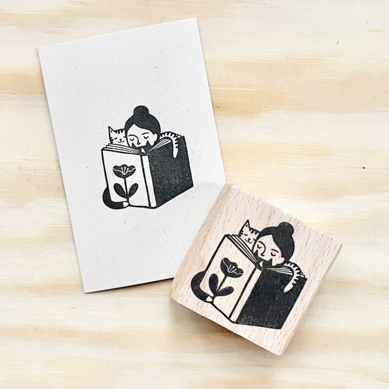 Stempel | BoekenwurmGezellige stempel met lezend meisje met katten, voor in je journal, maar ook leuk om te gebruiken als ex libris stempel.